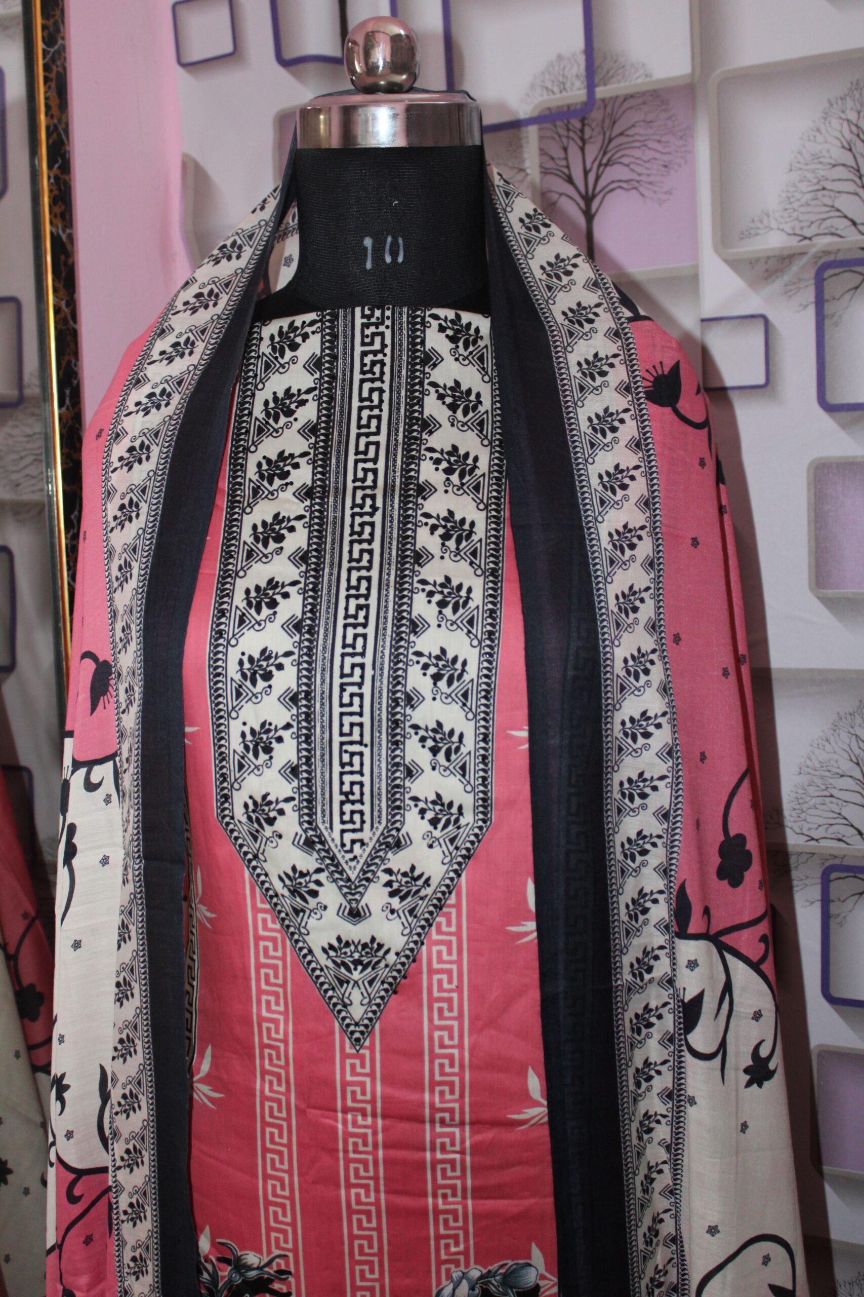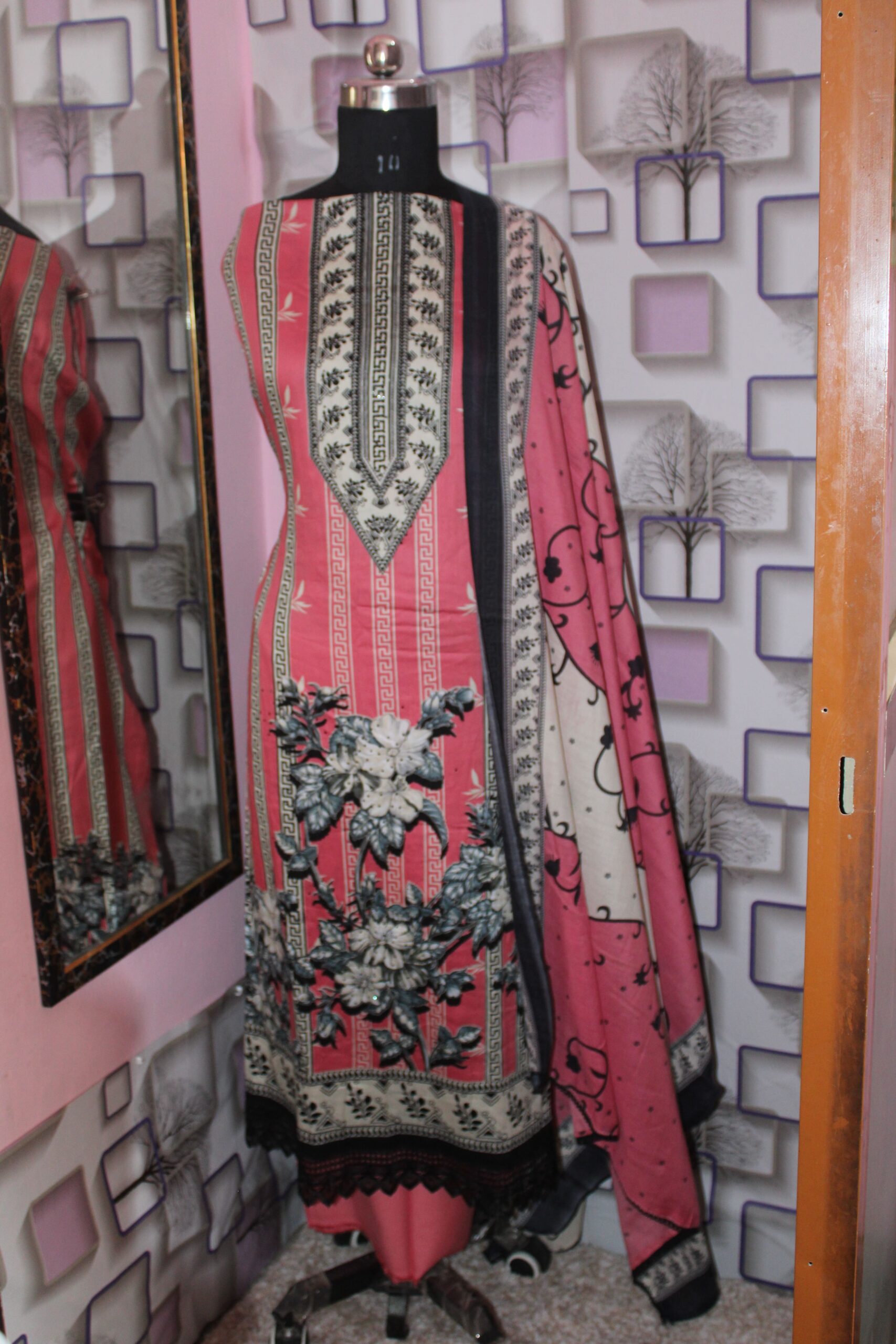 “Amaira” redefines elegance with edge β featuring a rose-pink cambric kurta with bold monochrome florals, Greek-style vertical motifs, and black embroidered borders. Paired with a matching printed cotton dupatta and solid base bottom, this striking set is boutique-stitched to your measurements for a structured yet feminine fit.